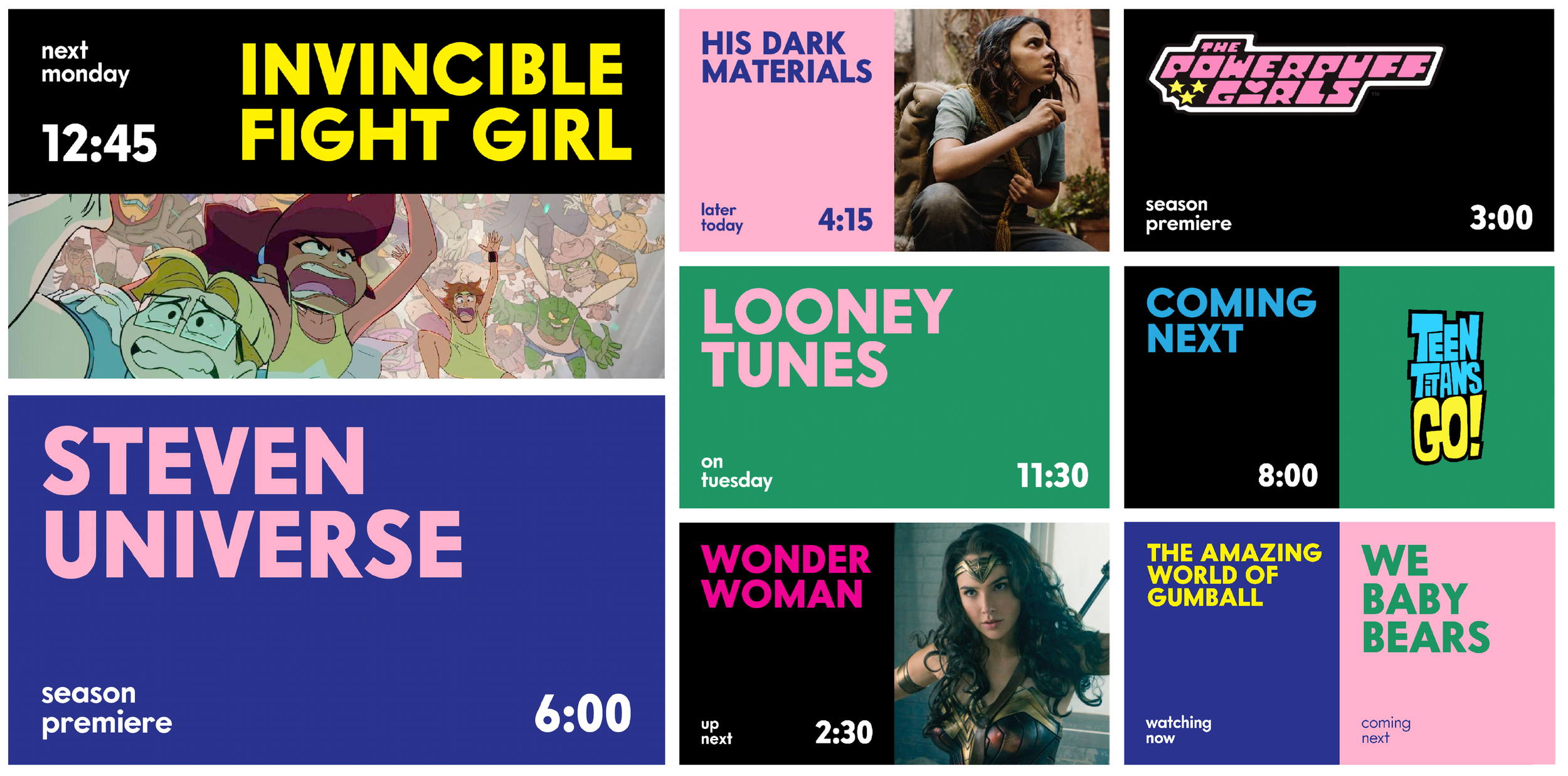 With the shift to HBO Max, the brand was reimagined as a design-forward, modular system rooted in CN’s original DNA. By elevating the checkerboard logic, geometric structure, and CMYK foundation, the identity gained the clarity and sophistication needed to sit alongside franchises like Harry Potter, DC, and Wonder Woman—without losing the playful energy fans associated with Cartoon Network.