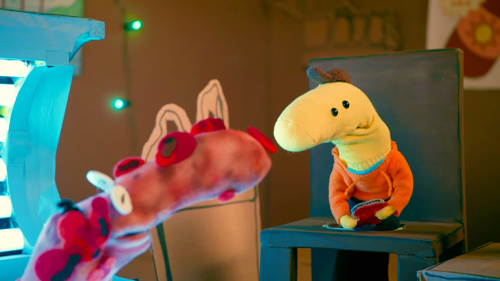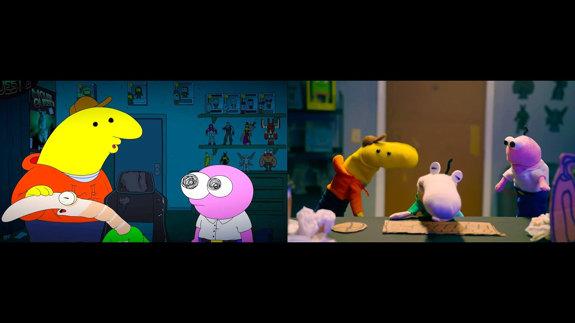 Each episode was done in a completely different puppet style. Mr. Frog got the full Muppet/felt treatment. Shrimp's Odyssey was sock puppets. Charlie Dies and Doesn't Come Back we made entirely in-house — our Adult Swim team built every puppet, filmed it, puppeteered it, and handled all the compositing ourselves. It was a full team effort in the truest sense — writers, designers, all of us building and painting puppets together to get it done.