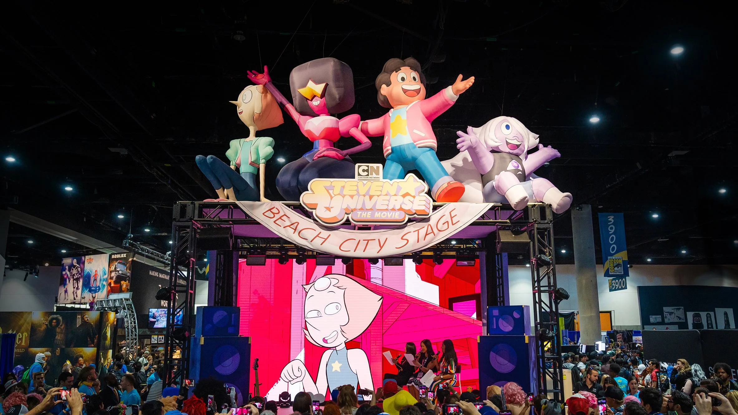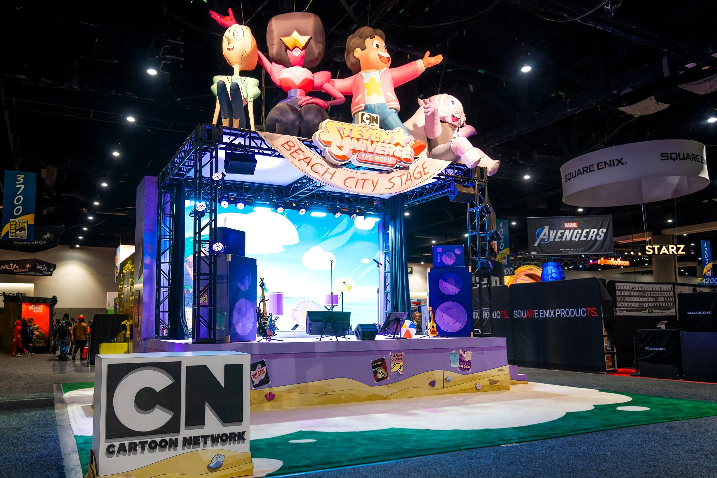 To celebrate Steven Universe: The Movie, we transformed the booth into a live Beach City Stage — part performance venue, part fan playground. The experience centered on Steven Universe karaoke, inviting fans to step on stage and sing along to songs from the series in front of a Comic-Con crowd. Oversized character sculptures, bold scenic elements, and an LED performance backdrop turned the booth into a spectacle that pulled people in from across the floor. Branded takeaways and interactive moments extended the experience beyond the stage, creating something that felt less like a marketing activation and more like a genuine celebration of the show and its fandom.